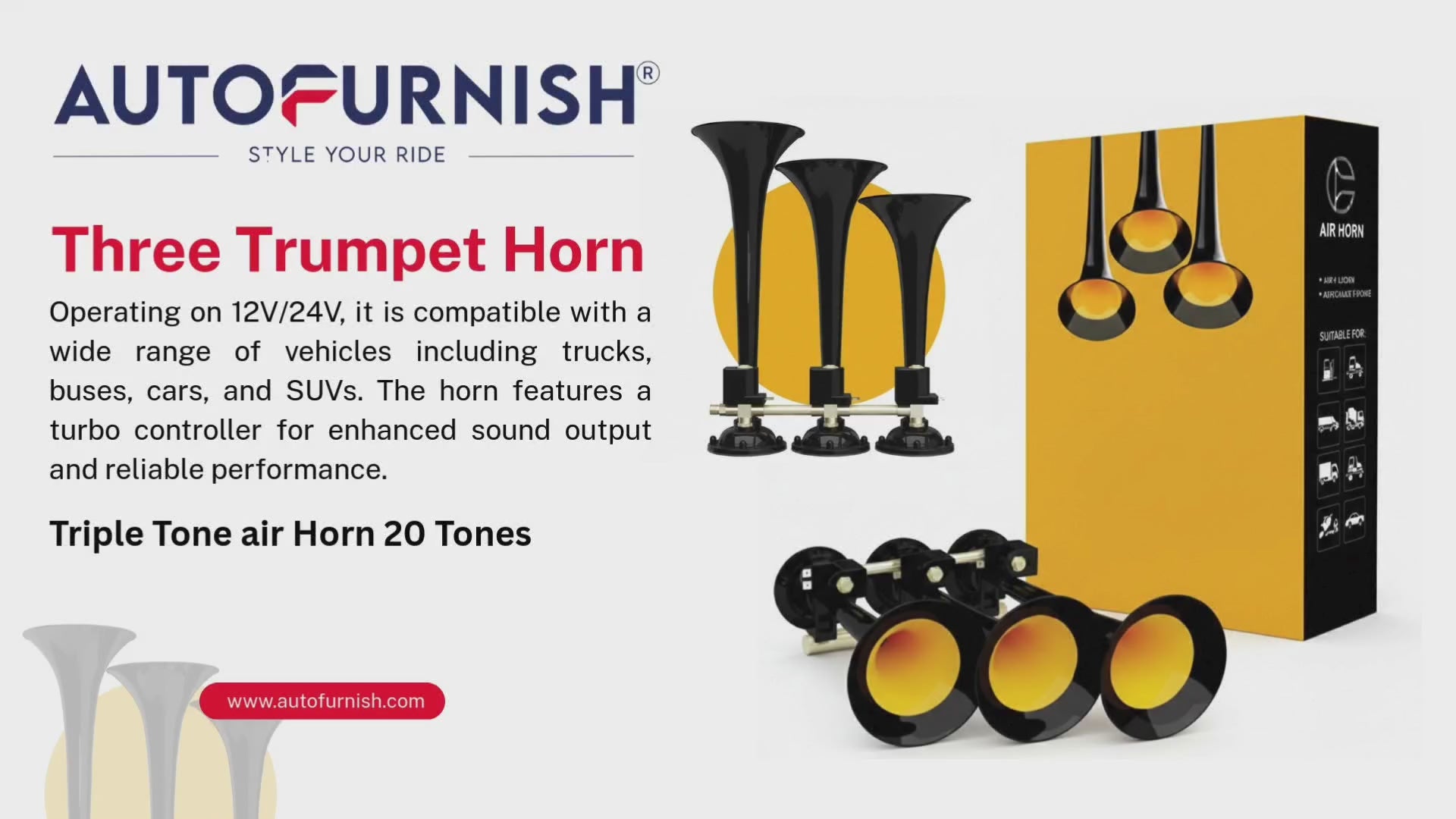 The horn comes with an optional 16-tone melody function and a turbo controller for smooth tone switching and consistent sound performance. Built with a heavy-duty powder-coated finish, it offers excellent durability, corrosion resistance, and a long service life even in demanding environments.